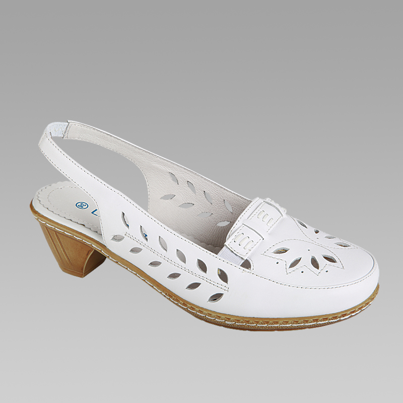 Белые босоножки с закрытым носком, из натуральной кожи, на невысоком устойчивом каблуке.